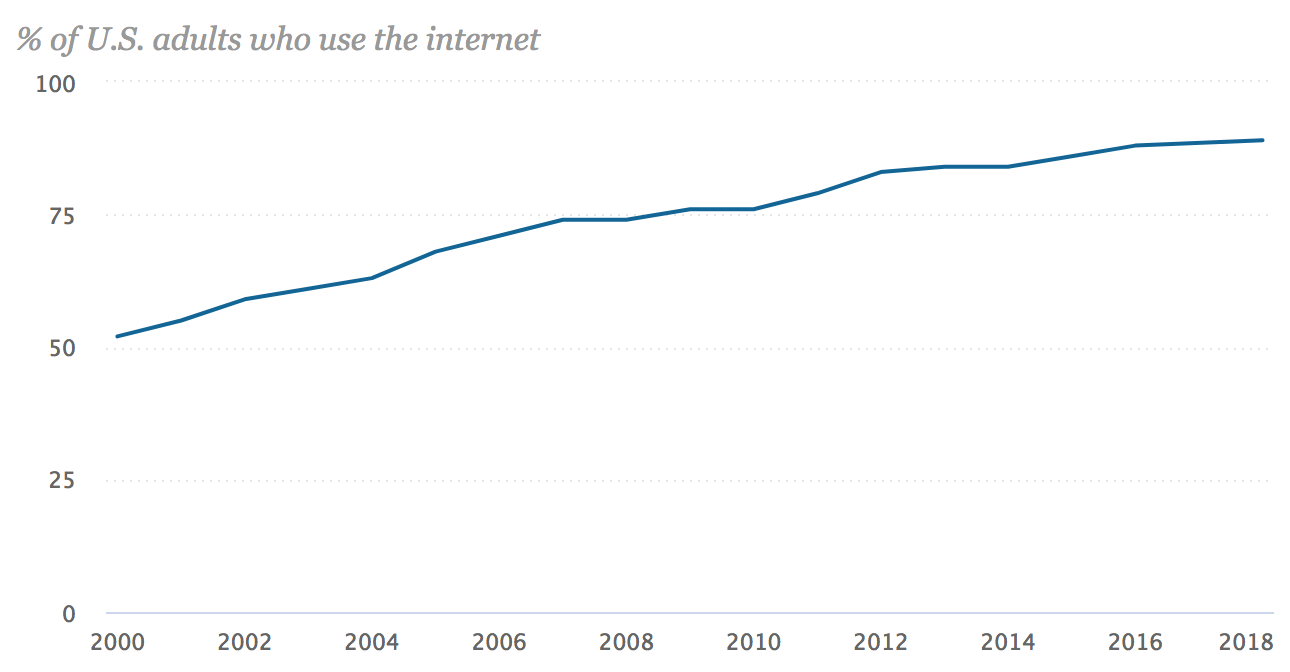 Zenith (a media agency) tracks this info on a global scale (I’ve not found other sources). They’ve only been publishing reports for the last four years, but I found a Recode article that interviews the head of forecasting at Zenith (Jonathan Barnard). This article provides historic data back to 2010, and forecasts to 2019, contrasting North America with the global average. The article was published in May 2017, and Zenith published a new report in 2018 with slightly different data for the last few years and looking forward, but the most recent report does not provide the context of the previous 10 years. For consistency of methodology, I’ve just used the data quoted by Recode for the following extrapolation.